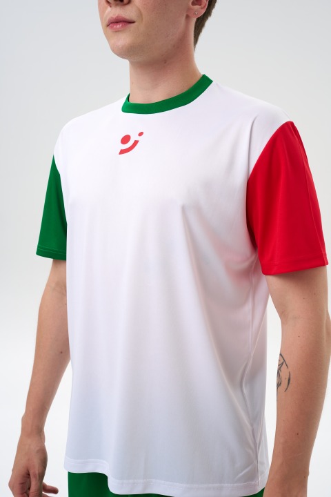 Белая мужская теннисная футболка letom с разноцветными рукавами — удобная спортивная футболка для тренировок и матчей с нескучным дизайном.