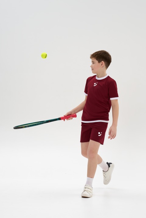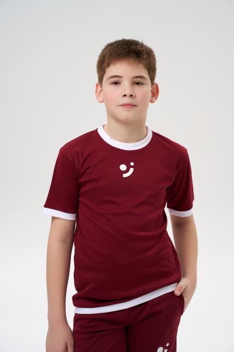 Бордовая детская теннисная футболка letom с белой окантовкой — удобная спортивная футболка для тренировок и матчей с нескучным дизайном.