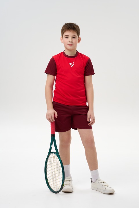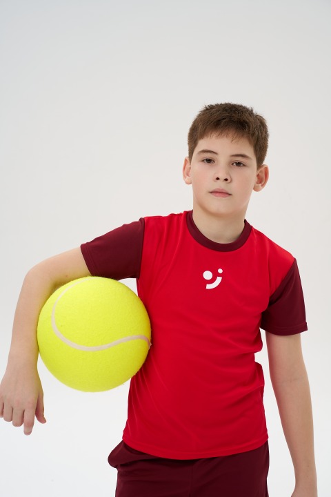 Красная детская теннисная футболка letom с бордовыми рукавами — удобная спортивная футболка для тренировок и матчей с нескучным дизайном.