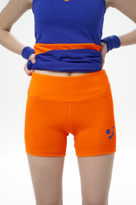 Женский спортивный костюм состоит из синего теннисного платья с ооанжевым поясом и оранжевых базовых шорт letom — удобная спортивная форма для тренировок и матчей.